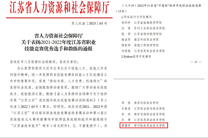 3月21日,江蘇省人力資源社會保障廳發布了《省人力資源社會保障廳關於(yú)表揚2021-2022年度江蘇省職業技能競賽優秀選手和教練的通報》(蘇人社函〔2023〕65 號),常州機電(diàn)職(zhí)業技術學院教師黃慷明在2022年度“江蘇工匠”崗位練兵職業技能競賽省級競賽活(huó)動(dòng)中取得優異成績,並被授予“江蘇省技術(shù)能手”稱號(hào)。