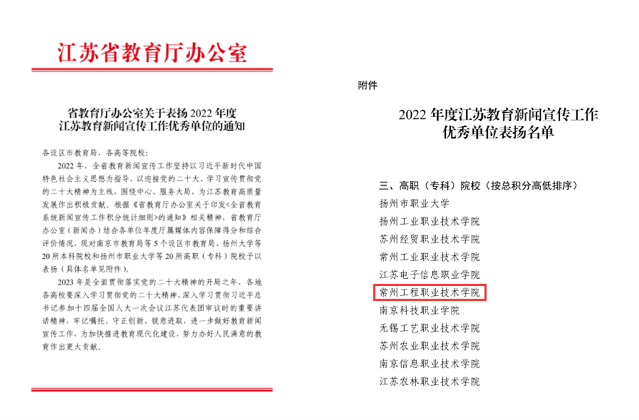 日前,江蘇省教育廳(tīng)辦公室發布《關於表揚2022年度江蘇教育新聞宣傳工作優秀單位的通知》,結合各單位年度廳屬(shǔ)媒體內容(róng)保障(zhàng)得分和綜合評價情況,對5個設區市教育局(jú)、20所本科院校和20所(suǒ)高職(專(zhuān)科)院校予以表揚。常州工程職業技術學院(yuàn)獲評2022年(nián)度“江蘇教育新聞宣傳工作優秀單位”,自2018年以來,學校已連續5年獲省教育廳表彰。