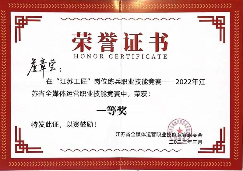 常州工業職業技術學院學子獲“江蘇工匠”崗(gǎng)位練兵全(quán)媒體運營職業(yè)技能競賽(sài)一等獎(jiǎng)