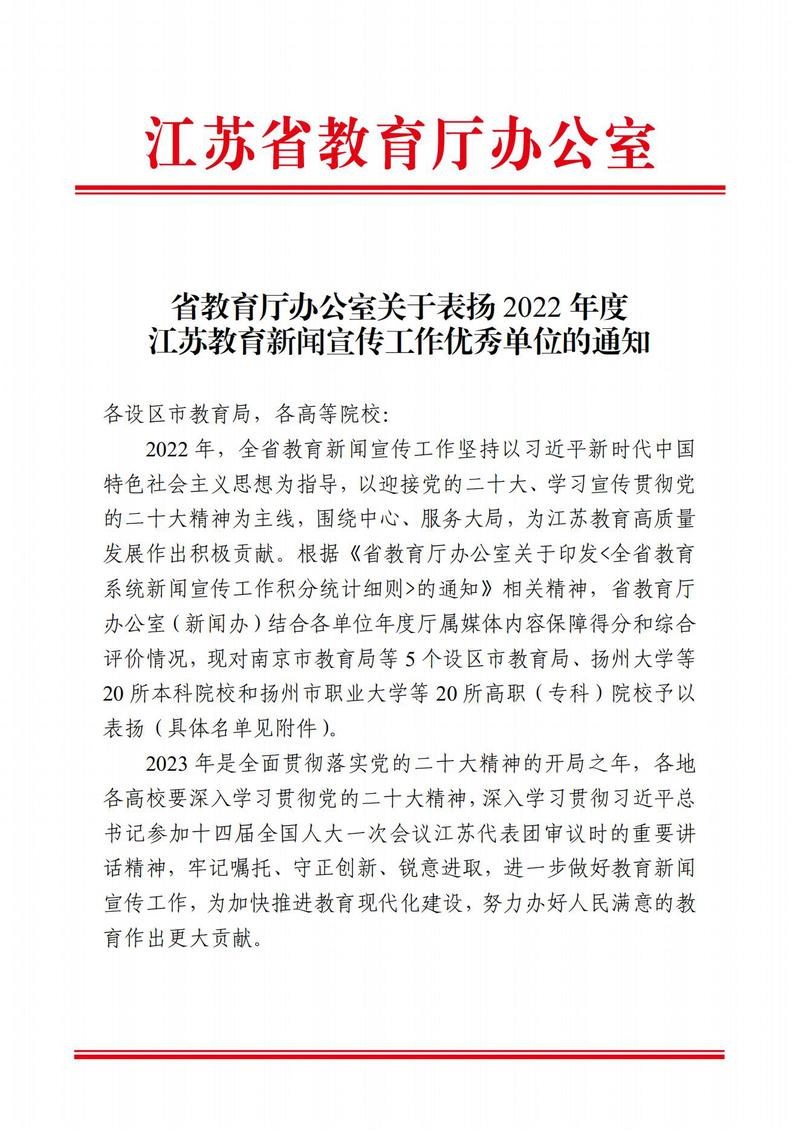 近日,江蘇省教育廳辦公室發布了《關於表揚2022年度江蘇教育新聞宣傳工作優秀單位的通知》。結合各單位年度廳屬媒體內容保障得(dé)分和綜合評價情況,省教育廳對5個設區市(shì)教育局、20所本科院校和(hé)20所高職(專科)院校予以表揚。常州工(gōng)業職業技術學院(yuàn)2022年度新聞宣傳總積分位列全省高職院校第4,被表彰為“2022年度江(jiāng)蘇教育新(xīn)聞宣(xuān)傳工作優秀單位”。至此,學校已連續6年獲此殊榮(róng)。