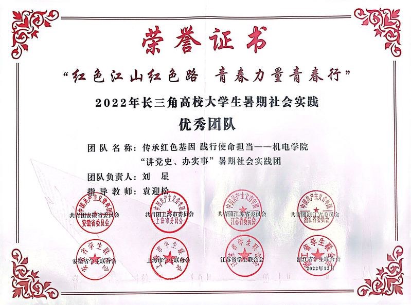 近日,由共青團安徽省委、共(gòng)青團上海市委、共青團(tuán)江蘇省委、共青團浙江省(shěng)委、安徽省學生(shēng)聯合會、上海市學生(shēng)聯合會(huì)、江蘇(sū)省學生聯合會、浙江省學生聯合會聯合舉辦的“紅色江山紅(hóng)色(sè)路青春力(lì)量青春行”2022年長(zhǎng)三角高校大學生暑期社會實踐專項活動表彰儀式在安徽宣城召開,常州紡(fǎng)織(zhī)服裝職業技術學院的機電學院袁迎(yíng)鬆老師指導、計網2131班劉星(xīng)負責的傳承紅色(sè)基因(yīn) 踐行使命擔當——機電(diàn)學院(yuàn)“講黨史、辦實事”暑期社會實踐團獲“優秀團隊”獎。