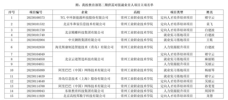 近日,教育(yù)部高校學生司公布了第二期供需對接就業育人項目立項(xiàng)名單,常州工業職業技術學院申報的15項就業育人項目獲(huò)批立項(xiàng),其中包括定向人才培養(yǎng)培訓項目7項,就業實(shí)習(xí)基地項目5項,人(rén)力(lì)資源提升項目3項。