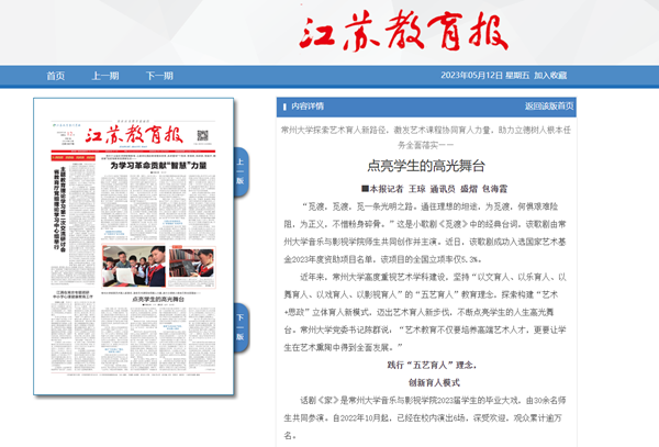 5月12日,《江蘇教育報》頭版以《點亮學生的高光舞(wǔ)台》為題,從“踐行‘五藝育人’理念,創(chuàng)新育人模式”“聚焦‘紅色文化’特色,擔當育人使命”“畢業即就業,點亮學(xué)生人生舞台”等方麵報道常州大學高度重視藝術學科(kē)建設,堅持“以文育人、以樂育人、以舞育人、以戲育人、以影視育(yù)人”的(de)“五藝育人”教育理念,探索構建(jiàn)“藝(yì)術+思政”立體育人新模式,邁出藝術育人新步伐,不斷點亮學生(shēng)的人生高光舞台。全文如下: