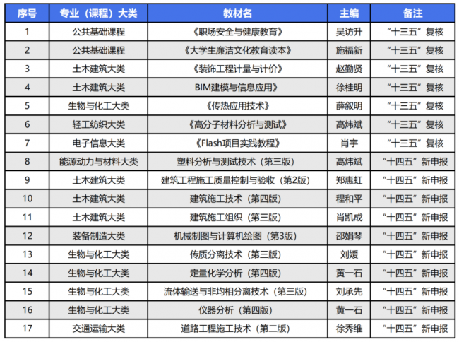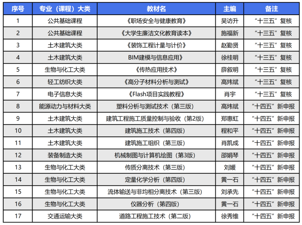 近(jìn)日(rì),教育部發布《關於擬入選首(shǒu)批“十四五”職業教育國(guó)家規劃教材名單的公示》,對擬(nǐ)入選首批“十四五”職業教育國家規劃教材的7262種教材進行(háng)公示,常州工程職業技術學(xué)院17部教材(cái)榜上有名,其中“十三(sān)五”複核教材7本(běn)、新申報入選教材10本,新申報教材入選“十四五”職業教育國家規劃(huá)教(jiāo)材數位居全國高職院校第(dì)14位、江蘇省高職院校第1位。