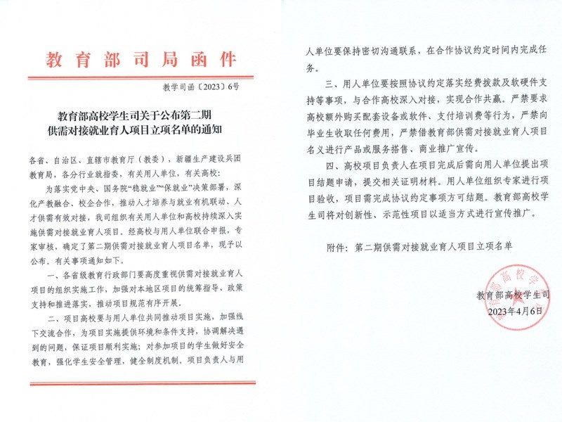 供需對接就業育人項目是教育部為落實黨中央(yāng)、國務院“穩就業”“保就業(yè)”決策部署而組織開展,旨(zhǐ)在通過政府搭台、企業支持、高校對接、共建共享,深化產教融(róng)合,以產業和技術發展(zhǎn)的最新需求來推動高校人才培養改革,促(cù)進(jìn)培養目標、師資隊伍、資源配(pèi)置、管理服務的多方協同(tóng),實現(xiàn)教育鏈(liàn)、人才鏈與產業鏈、創新鏈有機(jī)銜接(jiē),培養支撐引(yǐn)領經濟社(shè)會發展需要的高素質技術技能人才。