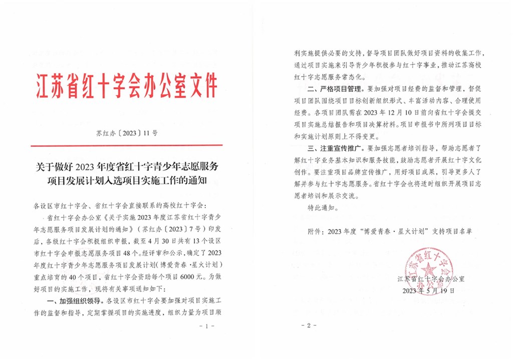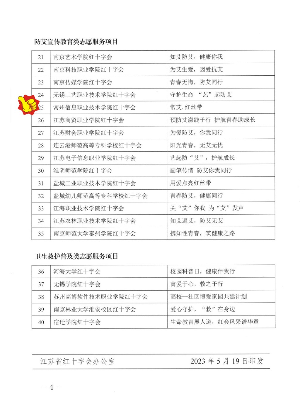 近(jìn)日,省紅十字會公(gōng)布了2023年度紅十字青少年(nián)誌願服務項目發展(zhǎn)計劃(博愛青春星(xīng)火計劃)項(xiàng)目名(míng)單,常州信息職業技術學院項目《“常艾·紅絲(sī)帶”防(fáng)艾宣傳教育項目》成功入(rù)選重點培育項目。此次全省(shěng)共有(yǒu)40個項目入選,學校(xiào)項目為在常高校唯一入選的項目。