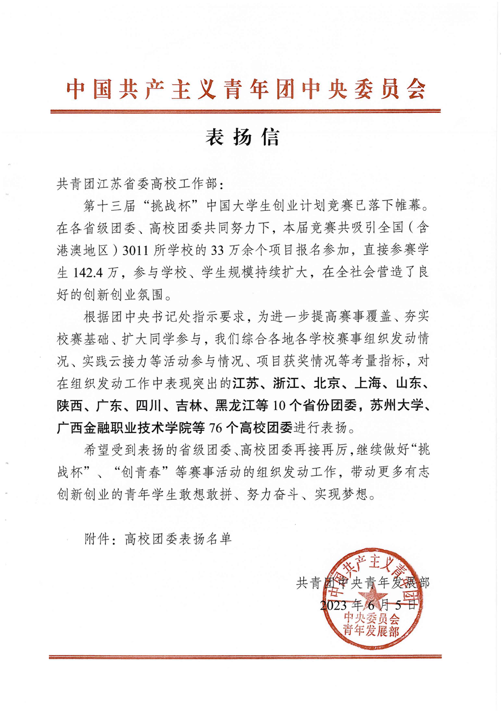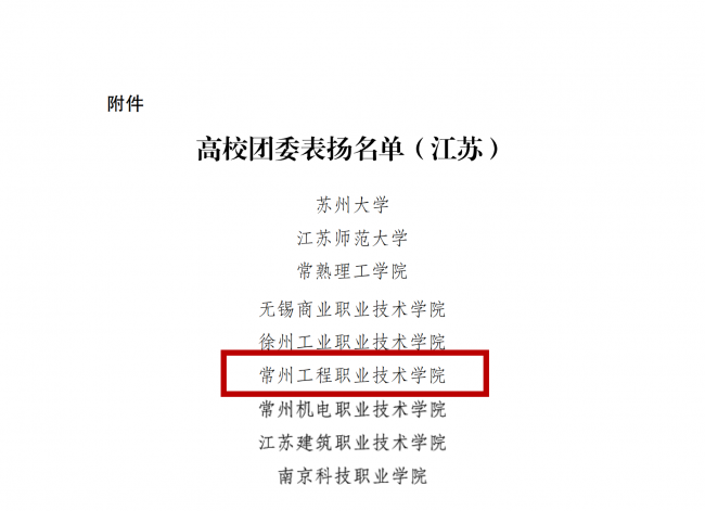 近(jìn)日,共青團中央對在第十三屆“挑戰杯(bēi)”中國大學生創業計劃競賽組織發動工作中表現突出的10個省份團委和76所高校進行(háng)表揚,江蘇共(gòng)有24所高校,常州工程職(zhí)業技(jì)術學(xué)院獲(huò)表揚在列。