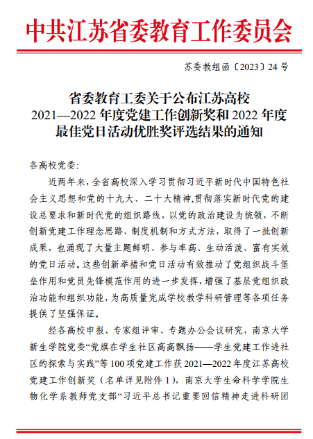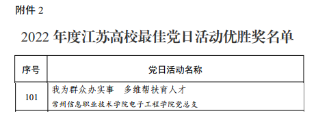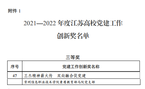 近日(rì),中共江蘇省委教育工委公布了2021—2022年度高校“黨(dǎng)建工作創新獎”及2022年度“最佳黨日活動”優勝獎評選結果(蘇委(wěi)教組函〔2023〕24號),常州信息職業技術學院素質教育(yù)部黨總支馬院黨支部的“三(sān)傑精(jīng)神薪火(huǒ)傳雙向融合促(cù)黨建”獲(huò)“黨建工作(zuò)創新獎三等獎”,電子(zǐ)工程學(xué)院黨(dǎng)總支的“我為(wéi)群眾辦實事多維幫扶育人才”獲“最佳黨日活動優勝獎”。