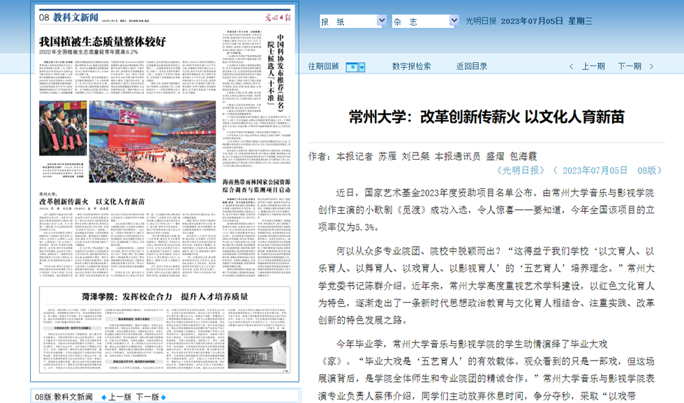 7月5日,《光明(míng)日報(bào)》以“常州大學:改革創(chuàng)新傳薪火以文(wén)化人育新苗”為題報道我校探索構建“藝術+思政”立體育(yù)人新模式,以紅色文(wén)化育人為特色,逐漸走(zǒu)出了一條新時代思想政治教育與文化育(yù)人相結合(hé)、注(zhù)重實踐、改革創新的特色發展之路。全文如下: