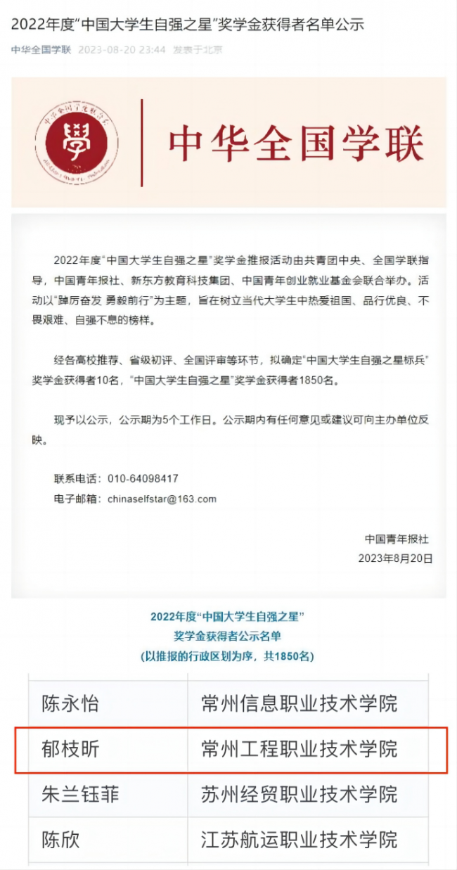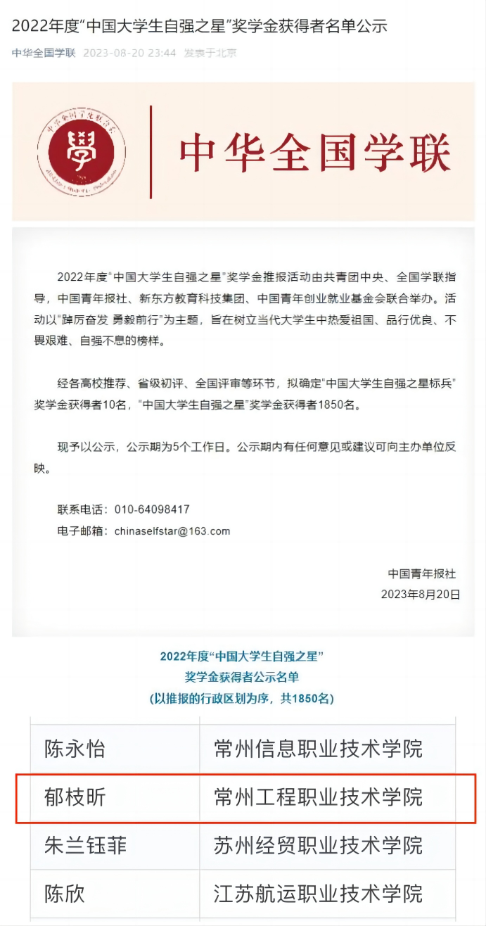 近日,由共青團中央、全國學聯指導(dǎo),中國(guó)青年報社、新東方(fāng)教育科技集團、中國青年創業就(jiù)業基金會聯(lián)合舉辦的2022年度“中國大(dà)學生自強之星”活動的評選結果正式揭曉。經(jīng)學校推薦、省級初評(píng)、全國評審等環節,常州工程職業(yè)技術學院鬱枝昕同學榮獲2022年度“中國大學生自強之星”。