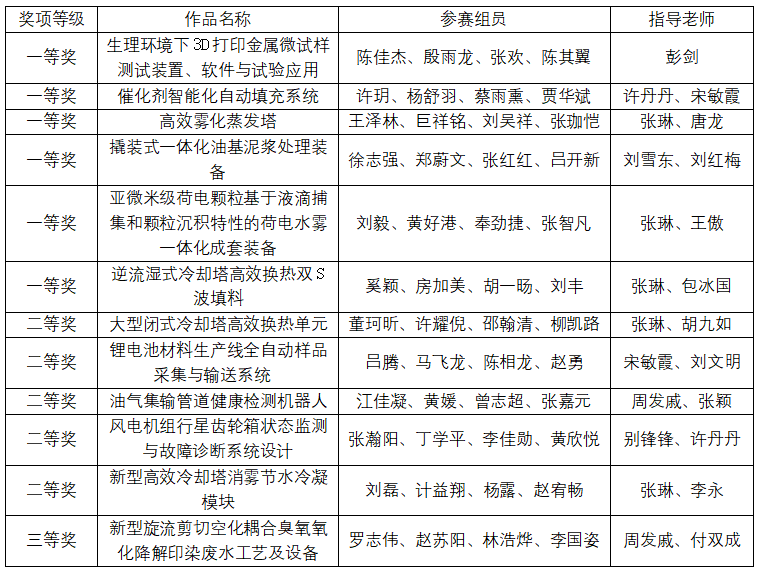 常州大學機械與軌道交通學院學子再(zài)創佳(jiā)績,實現了一等獎數量和質量的(de)雙(shuāng)重突破。機械與軌道交通學院陳佳傑、殷(yīn)雨龍、張歡(huān)、陳其翼的作品《生理環境(jìng)下3D打印(yìn)金屬微試(shì)樣測試裝置、軟件與試驗應用》,許玥、楊舒羽、蔡雨熏、賈華斌的作品《催化劑智能化自動填充係統》,王澤(zé)林、巨祥銘、劉吳祥、張珈愷的作品《高效霧化蒸發塔》獲本科生(shēng)組一等獎;徐誌(zhì)強、鄭蔚文、張紅紅、呂開新的作品《撬裝式一體化油基泥(ní)漿(jiāng)處理裝備》,劉毅、黃好港、奉勁捷、張智凡(fán)的作(zuò)品《亞微米級荷電顆粒基於液滴(dī)捕集和(hé)顆粒沉積特性(xìng)的荷電水霧一體化成套(tào)裝備》,奚(xī)穎、房加美、胡一暘、劉豐的作品《逆流濕式冷卻塔高效換熱雙S波填料》獲研(yán)究生組一等獎(jiǎng)。同時,學校獲二等獎5項、三等獎1項。