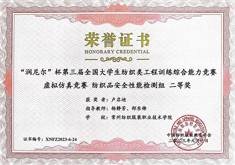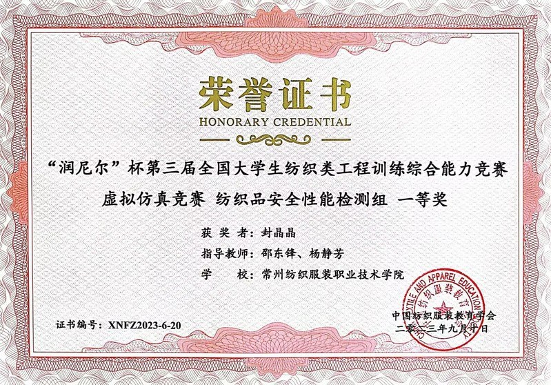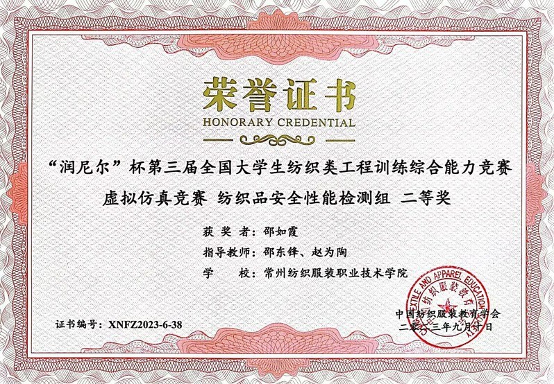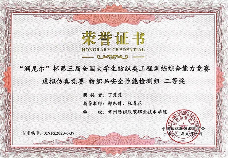 2023年9月9日,由中國紡(fǎng)織服(fú)裝教(jiāo)育學會主辦,山東科(kē)技職業學院、浙江紡織服(fú)裝(zhuāng)職業技術學院、山東圖靈鍶軟件有限公(gōng)司、北京歐倍爾軟件技術開發有限(xiàn)公司承辦的“潤尼爾”杯第三(sān)屆全國紡織類大學生工程(chéng)訓(xùn)練綜合能力競賽高(gāo)職賽道“F組紡織品安全(quán)性能檢測”、“G組現(xiàn)代紡織虛擬仿真”2個賽項決賽順利(lì)結束。9月17日,舉行了(le)頒獎典禮。