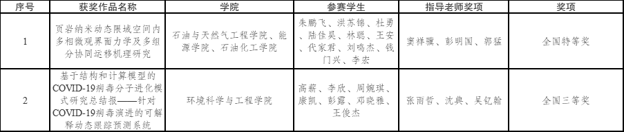第十八屆“挑戰杯”賽事分為主體(tǐ)賽、揭榜掛帥專項賽及(jí)部分專項活動。學校於今年2月開(kāi)始啟動“揭榜掛(guà)帥(shuài)”競賽的備賽工(gōng)作,經院級初賽、校級決賽,國賽網評、終審決賽等各環節,最終我校石油與天然氣工程(chéng)學院、石(shí)油化工(gōng)學(xué)院《頁岩納米動態限域空間內多相微觀界麵力學及多組分協同運(yùn)移機理研究》項目在“揭榜掛帥”專項賽中榮(róng)獲全國特等獎,環境科學與工程學院《基於結構和計算模型的COVID-19病毒分(fèn)子進化模式研究總結報——針對COVID-19病毒演進的可解(jiě)釋動態跟蹤預測係統》榮獲全國三等獎。特等獎團隊成員、資(zī)環212(研)的朱鵬飛同學表示,大賽帶來的不僅是榮(róng)耀的光環,更重要的是創新與挑戰的不屈精神,榮譽隻是(shì)瞬間,真正的旅程才(cái)剛剛開(kāi)始,希望自己未來(lái)能更加自信的迎接挑戰!