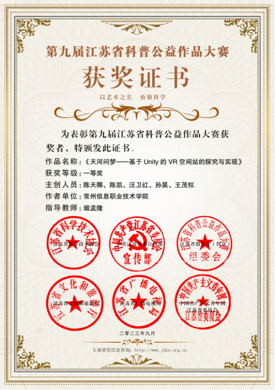 本次學校獲得一等獎的作品(pǐn),分別為數字創(chuàng)意學院動漫製(zhì)作(zuò)技(jì)術專業動漫(màn)技藝技能工作室創作的動畫作品《梓輯之術》(科普(pǔ)影視類(lèi),主創:梅怡檸,指導教師:孫金山、羅青、紀元)、動漫作品《二十四節氣》(科(kē)普影視類,主創(chuàng):計合鈺,指導教師:孫金山、石嘉忻、紀元)、虛擬(nǐ)現實應用技術專業創(chuàng)作的作品《天(tiān)河問夢(mèng)——基於Unity的(de)VR空間站的探究與實現》(平(píng)麵設計與空間設計類,主創:陳天賜、陳凱、汪衛紅、孫昊、王茂權,指導教師:琚孟隆)。同時,學校榮獲優(yōu)秀組織獎,孫金山、琚孟隆、石(shí)嘉忻(xīn)、紀元、羅青獲(huò)優(yōu)秀指導教師獎。