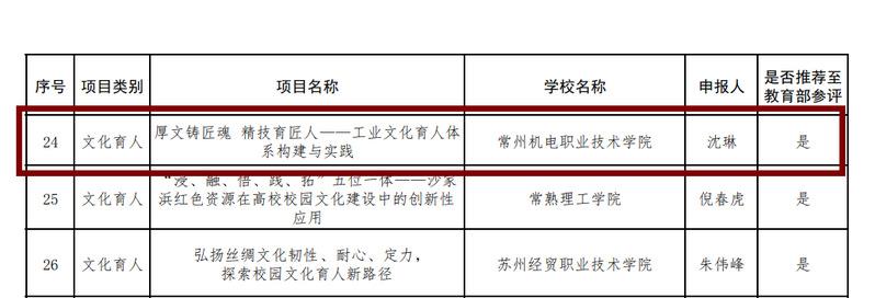 近日,省委教育工委、省教育廳公布了第二(èr)批江蘇高校思想政(zhèng)治工作質(zhì)量提(tí)升工程建設項目遴選結果。常州機電職業技術學院(yuàn)文化育(yù)人項目《厚文鑄匠魂 精技育匠人——工業文化育人(rén)體係構建與實(shí)踐》獲(huò)江蘇高校思政精品項目,並(bìng)被省教育廳推薦參加(jiā)教育部評比。