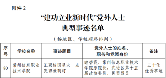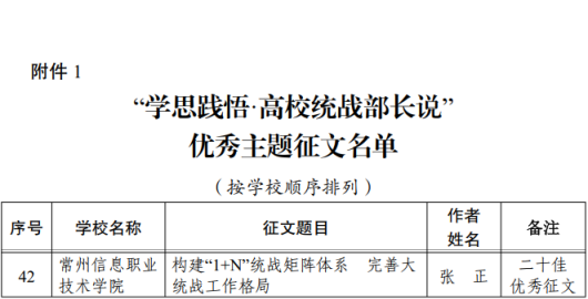 近日,省委教育工委公(gōng)布了全省(shěng)教育係統統一戰線“貫徹二十大(dà)精神同心共築教育(yù)夢”主題(tí)教育活動主題(tí)征文和案例征集遴選結果(蘇委教函〔2023〕27號),常州信息(xī)職業技術學院多項作品(pǐn)獲得佳績,張正撰寫的《構建“1+N”統戰矩陣體(tǐ)係(xì)完善大統戰工作格局》被評(píng)為“學思踐悟·高校統戰部長說”優秀主題征文,入選“二十佳優秀征文”。軟件與(yǔ)大數(shù)據學院黨(dǎng)總支選送的《匯聚校園星火 點亮職教明燈》(主人公:眭碧霞,民盟盟員,武進區(qū)武進區第十五屆政協委員)被評(píng)為“建功立業新時代”黨外人士典型事跡(jì),入選“三十佳優秀事跡”。《匯心聲、繪文化(huà)、慧服務 守護師生心理健(jiàn)康——記黨外代表人士徐暢工作(zuò)室》被評為“高校知聯會工作品牌案例”。獲獎數(shù)量和質量均位列全省高職院校前列。