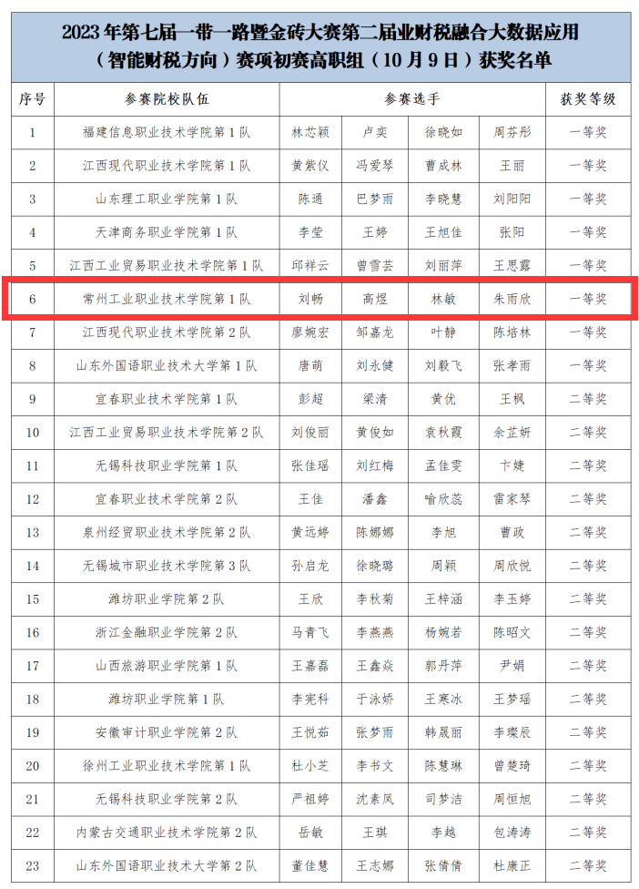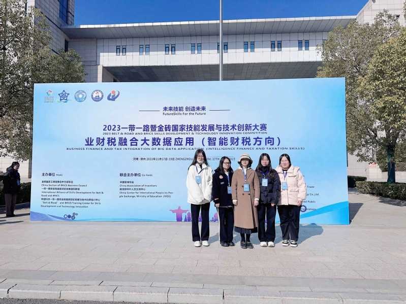 11月19日, 2023年“一帶(dài)一路”暨金磚大賽之第(dì)二屆(jiè)業財稅融(róng)合大(dà)數據(jù)應用(智能財稅方向)賽項(高職組)舉行全國決賽,常(cháng)州工業職(zhí)業技術學院數字商務學(xué)院參賽隊高煜、林敏、朱雨欣、劉暢同學以初賽(sài)一等(děng)獎的身份參加全國決賽,最終獲全國三(sān)等獎。