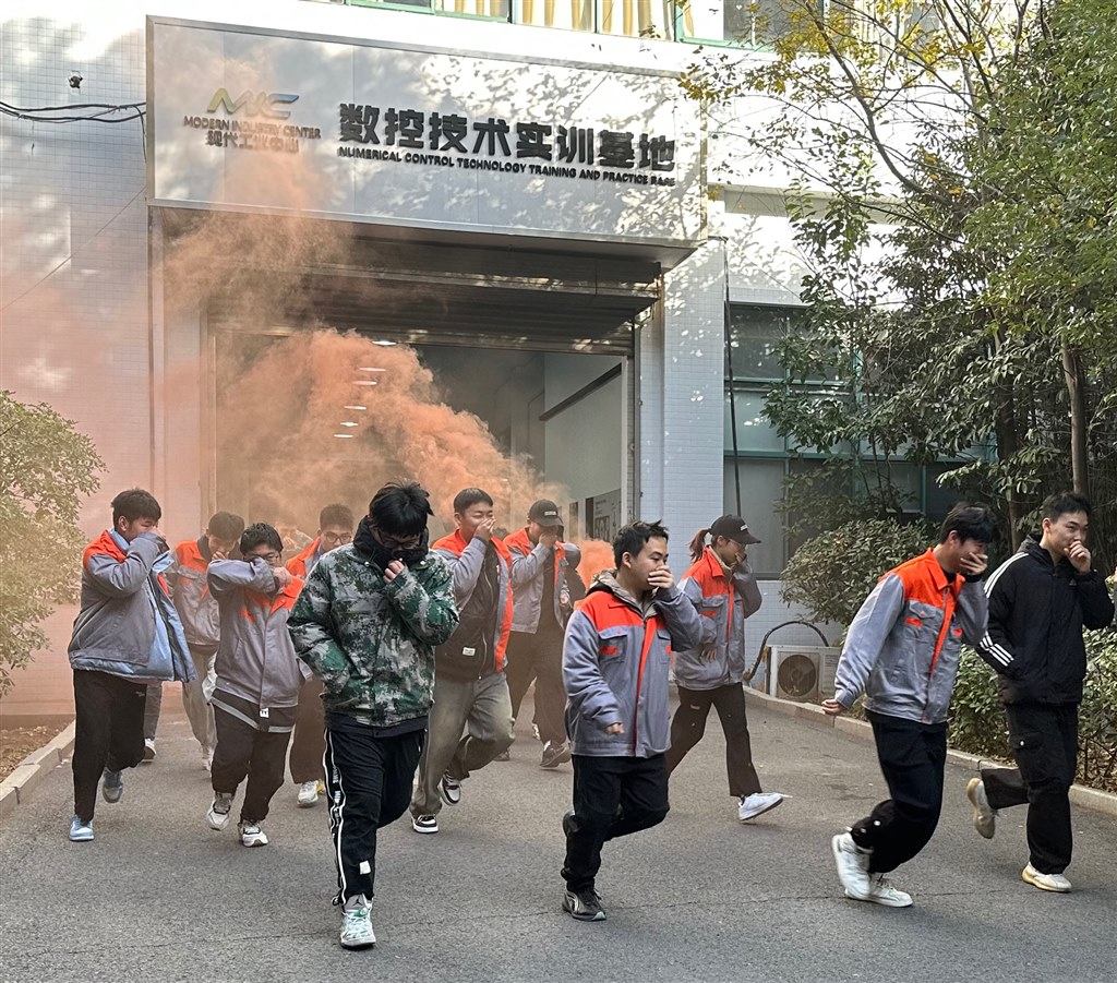 上午9時演練正式開始,演練現場(chǎng)模擬工業中心2號樓一樓實訓區電線短路引發火災,實訓師生立即向基地報告,基地管理員各司(sī)其職,現場滅火、切斷電閘、拉響警報(bào),全體(tǐ)實訓師生(shēng)在疏散人員的指引下,沿(yán)應急通道迅速(sù)有序撤離至(zhì)安全區域。