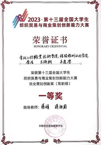 本(běn)次大賽由中國(guó)紡織(zhī)服裝教育學會(huì)主辦(bàn),東華大學與上海遠恒專修學院承辦(bàn),共有本科、專科(kē)56支代表(biǎo)隊(duì)、168名選手入圍決(jué)賽。檢測(cè)學院李浩、呂欣桐、朱逸瀅團隊獲得商(shāng)業策劃創新獎(高職組)一等獎,朱伊蕙同學獲得個人賽(高職組(zǔ))三等獎。