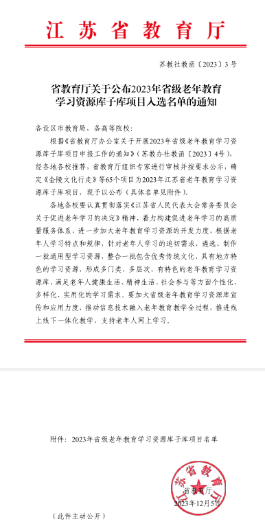 近日,江(jiāng)蘇省教育廳公布 2023年省級老年教育學習資(zī)源庫子庫項目(mù)入選名單的通知(蘇教繼函〔2023〕3號)。常州工程職業技術學(xué)院申報的“江蘇非遺:民間傳說與故事”和(hé)“涉外禮儀與修養”成功入(rù)選2023年度省級(jí)老(lǎo)年教育學習資源庫子庫項(xiàng)目。