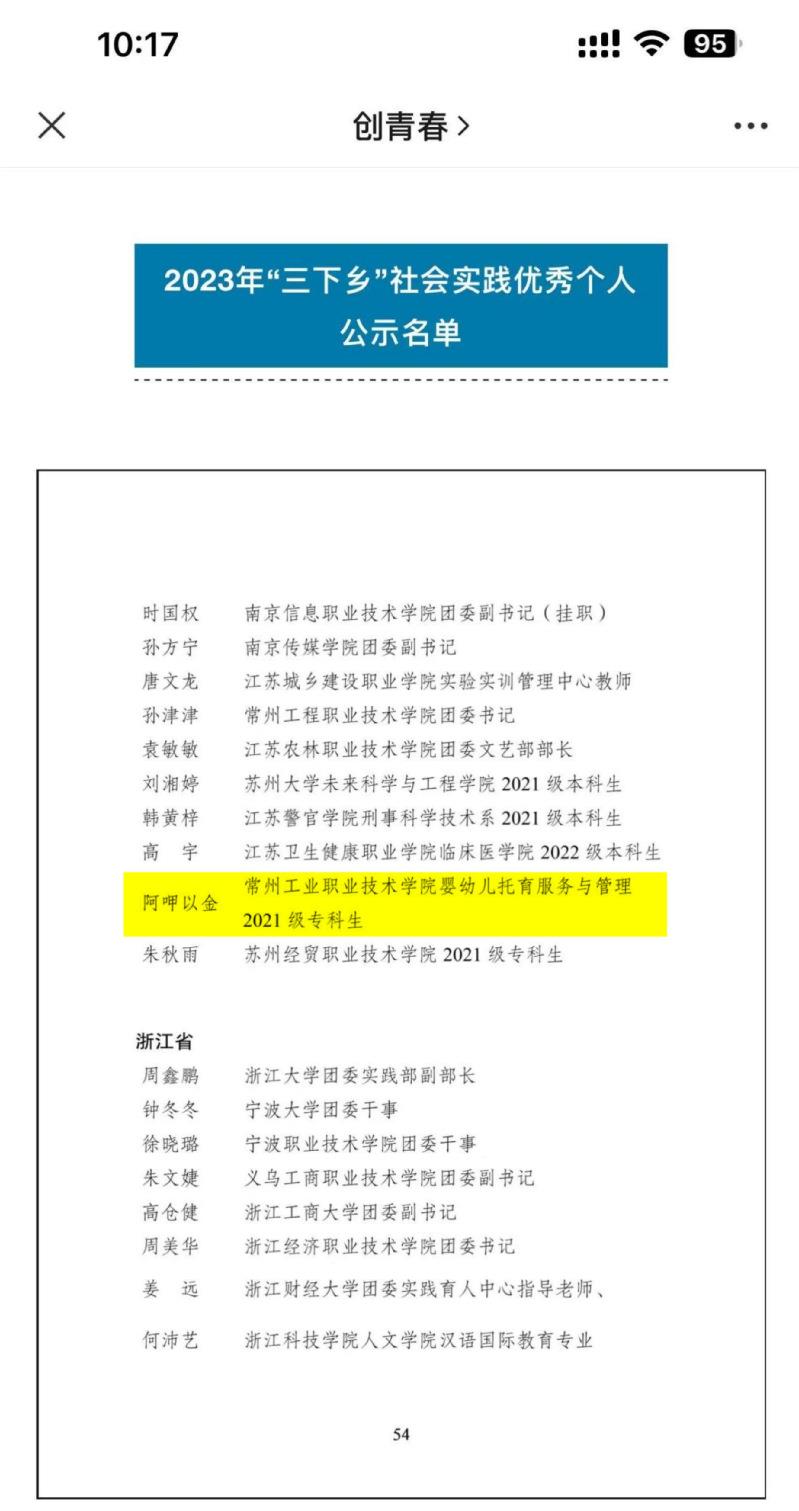 近日,團中央公布了2023年全國(guó)大中(zhōng)專學生誌願者(zhě)暑期文化科技衛(wèi)生“三下鄉”社會實踐(jiàn)活動評選結果,常州工業職業技術學院旅(lǚ)遊與康養學院阿呷以金同學(xué)獲評社會實踐優(yōu)秀個人。這是繼去年信息工程學院(yuàn)“‘蠶(cán)海桑田’裏的致富路——助(zhù)力蠶桑村蠶(cán)桑產業升級實踐團”獲評全國“三下鄉”社會實踐優秀團隊(duì)以來,學校再(zài)次被團中央表彰。