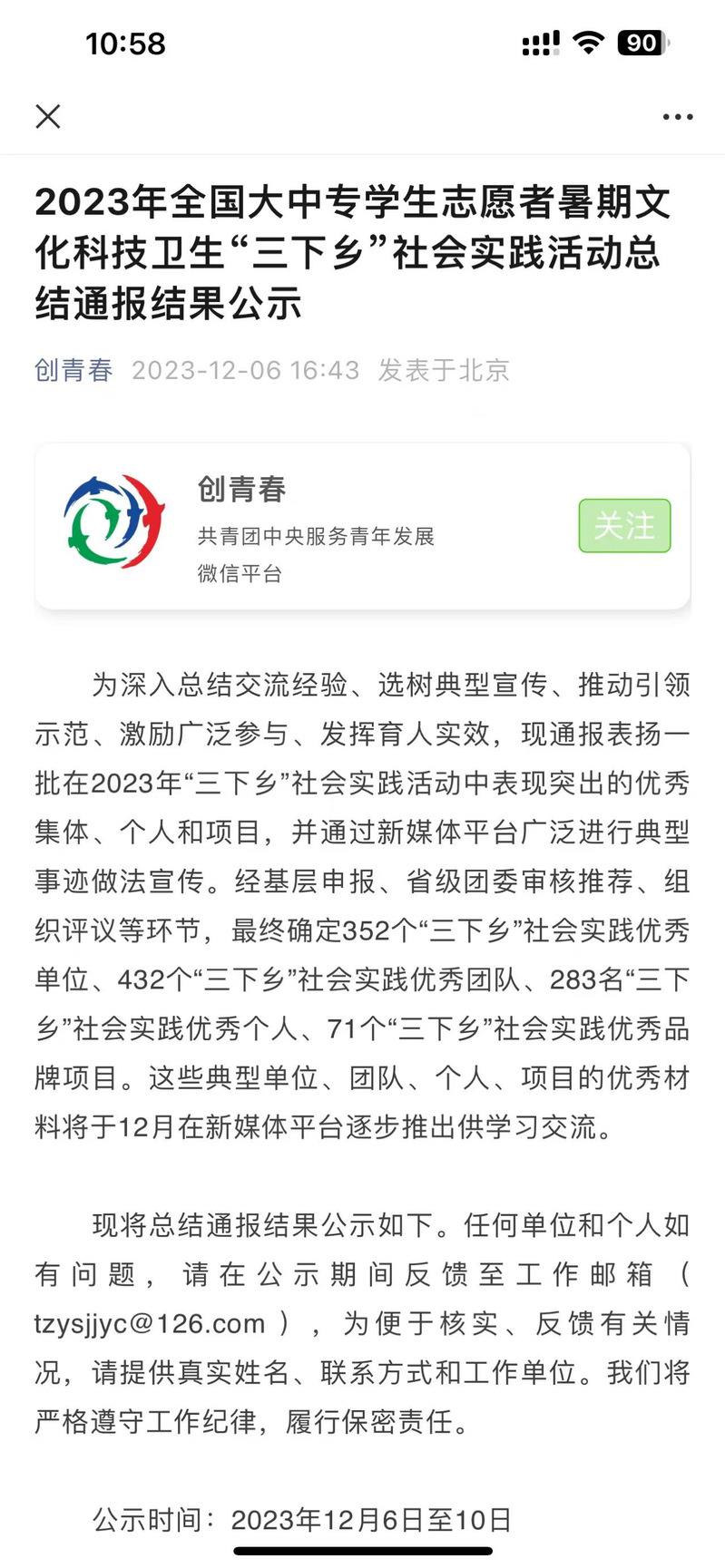 常州工業職業技術學院團員青年獲評2023年全國大中專學(xué)生誌願者暑期文化科技衛生“三下鄉”社會實踐優秀個人