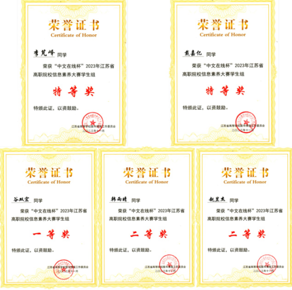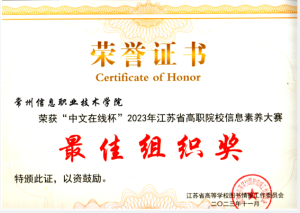 近日,2023年“中文在線杯”江蘇省高職高專院校信息素養大賽順利(lì)舉(jǔ)行(háng)。來自全省(shěng)50多所高職院校(xiào)、242名選手參加了比賽。經過激烈角(jiǎo)逐(zhú),常州信息(xī)職業技術學院5名參賽選手分別獲得(dé)特等獎2項、一等獎1項、二等獎(jiǎng)2項,學校獲“最佳組織獎”。其中,李芃嶧和戴嘉億2名同學入圍國賽。