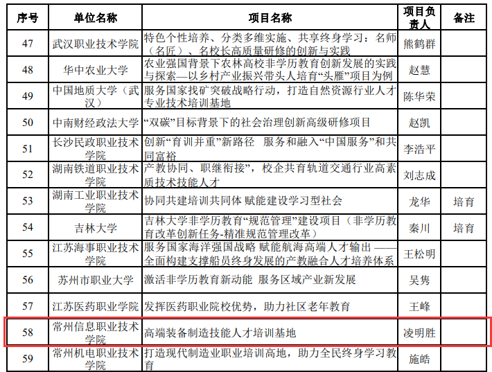 近日,教育部公示了2023年學習型社(shè)會建設(高等繼續教育領(lǐng)域)重點任(rèn)務名單,由(yóu)常州信息職業技術學(xué)院繼續教育學院申報的(de)《高(gāo)端裝備製(zhì)造技能人(rén)才(cái)培訓基地》項目入選非(fēi)學曆教育改革創新任務,江蘇省僅8所院校入選。