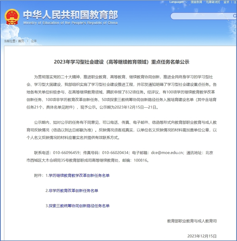 為貫徹落實黨的二十大精神,推進(jìn)職業教育(yù)、高等(děng)教育、繼續教育協(xié)同創新,推進全民終身學習的學習型社(shè)會、學習型大國建設,教育部(bù)組織實施了學習型社(shè)會建設推進(jìn)工程,並印發通知明(míng)確(què)了學習型社會建設重點任務。此次全國各高(gāo)校在(zài)高等繼(jì)續(xù)教育領域共申報了832項任務,經(jīng)過評議,有100項學曆繼續教育教學改革創新任務、100項非(fēi)學曆教育改革創新任務(wù)、50項探索三(sān)教統籌協同(tóng)創新路徑任務入圍培育建設名單。