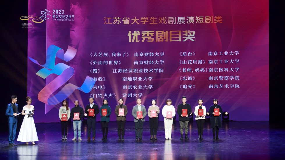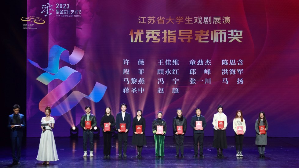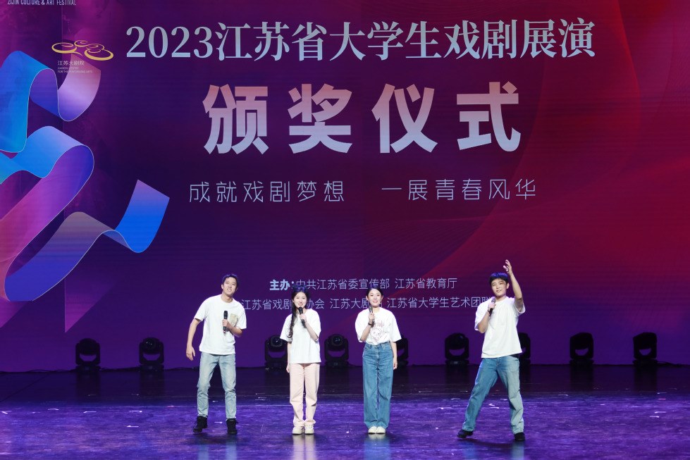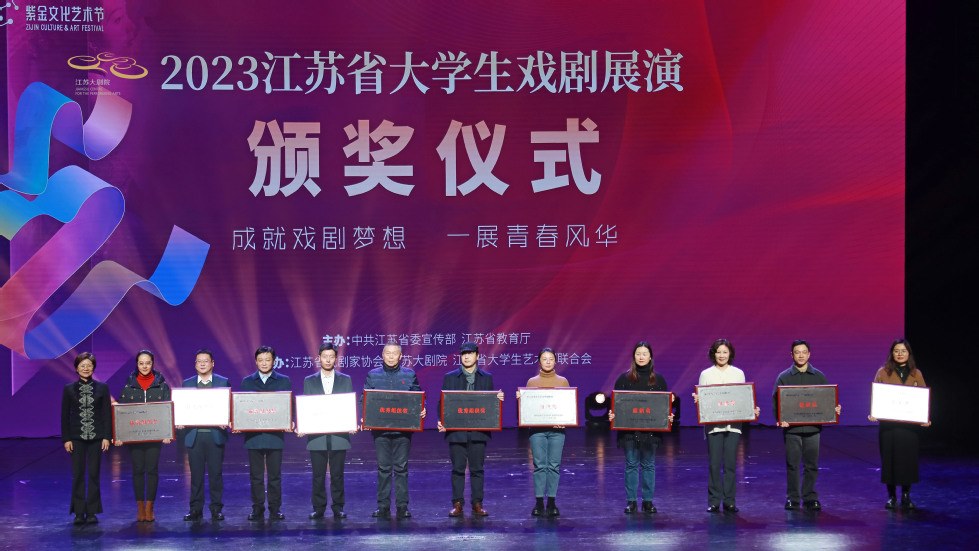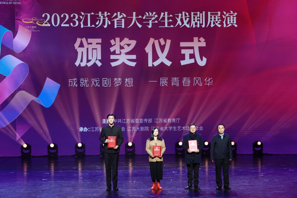 12月18日,2023江蘇省大學生戲劇展演頒獎儀(yí)式在江蘇大劇院舉行。常州大(dà)學原創詩話劇《月亮與煙火(huǒ)》獲長劇類一等獎,小品《門鈴(líng)聲聲(shēng)》獲短劇類優秀劇目獎,常州大學榮(róng)獲優(yōu)秀組織獎,童勁傑、陳思含獲優秀指導教師獎(jiǎng)。江蘇省委宣傳部副部長徐(xú)寧、省(shěng)教育廳二級(jí)巡視員李金泉、省文聯一級(jí)巡視員劉旭東等領導(dǎo)出席活動並(bìng)為獲獎單位及個人頒獎。我校黨委常委、副校長(zhǎng)楊琳出席活動,音樂與影視學院相關人員陪同參加。