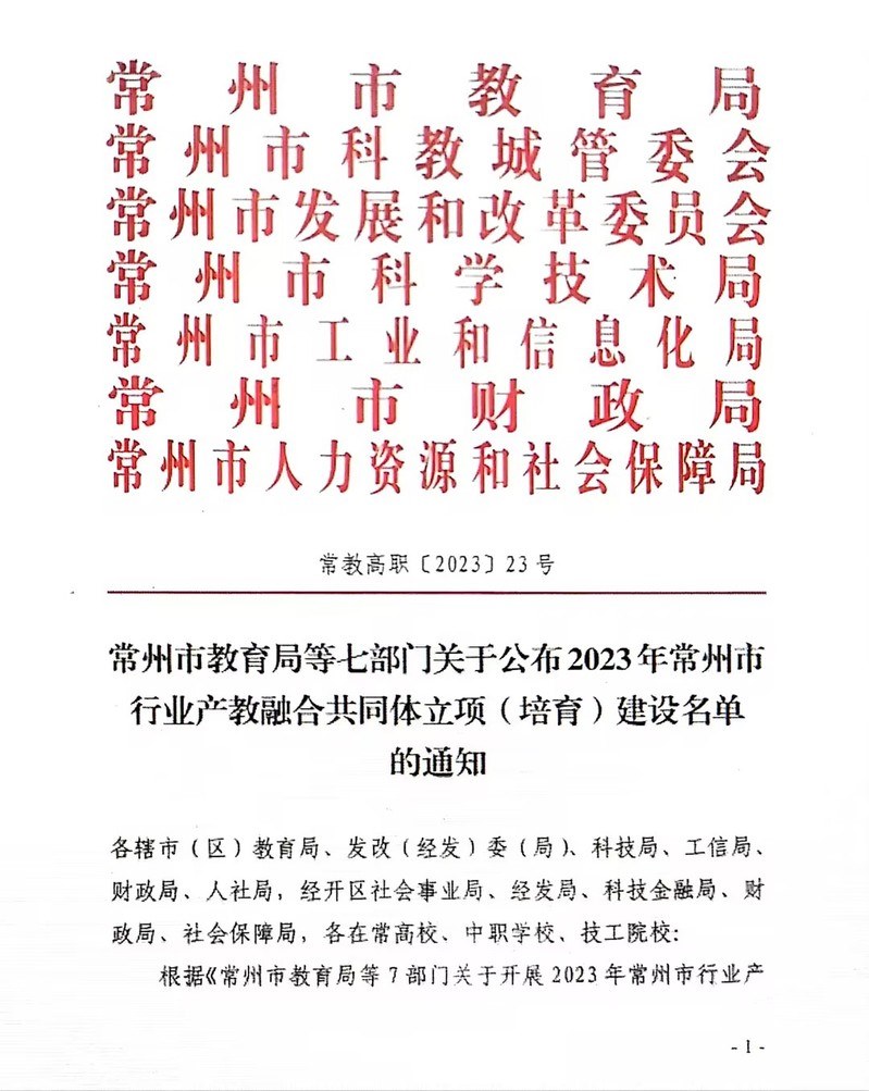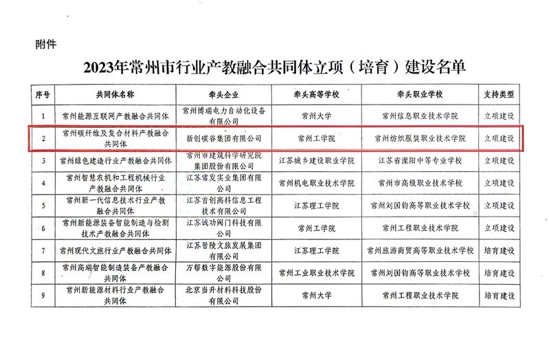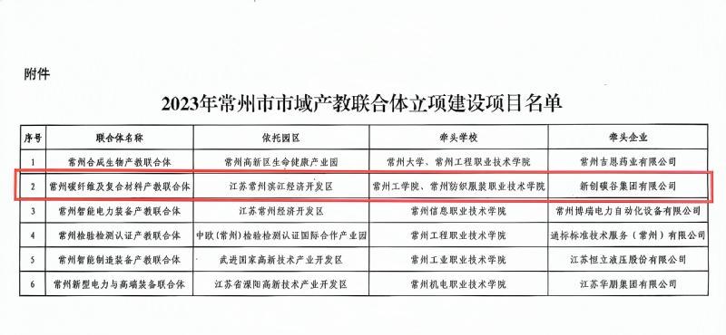 近日,根據《常州市(shì)教育局等七部(bù)門關於公布2023年常州市(shì)行業產教融(róng)合(hé)共同體立項(培育)建設名單的通知》和《常州(zhōu)市教育局等六部門關於公布2023年市域(yù)產教聯合體名單的通知》,常州紡織服(fú)裝職業(yè)技術學院牽頭(tóu)成立的常州(zhōu)市碳纖維及(jí)複合材料產教(jiāo)融合共同體項(xiàng)目和與常州工(gōng)學院共同牽頭的常州碳纖維及複合材料產教聯(lián)合體項目雙雙獲批立項(xiàng)。