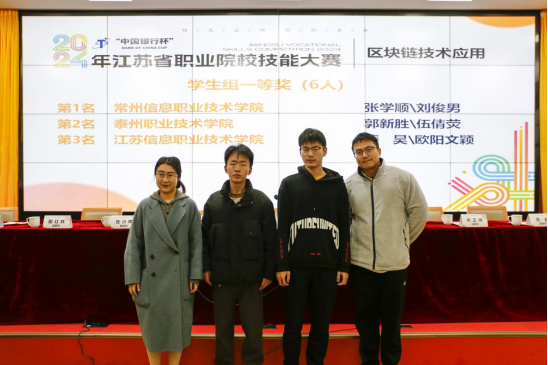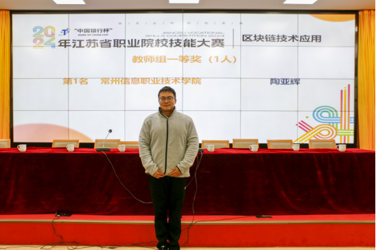 1月18日至20日,由江蘇省教(jiāo)育廳主辦、常州(zhōu)信息職業技術學院承辦的2024年江蘇省職業院校技能大賽高職組區塊鏈技術應(yīng)用賽項(xiàng)成功舉行。經過激烈角逐,由常信軟件與大(dà)數據學院雲大智鏈黨支部陶亞輝、馮清韻老師指導,區塊鏈(liàn)221班劉俊男、軟(ruǎn)件2211班張學順同學組成的參賽團隊斬獲學生組團體(tǐ)一等獎第一名,同時,陶亞輝參(cān)加教師組競賽(sài)榮獲一等獎第一名(míng)。