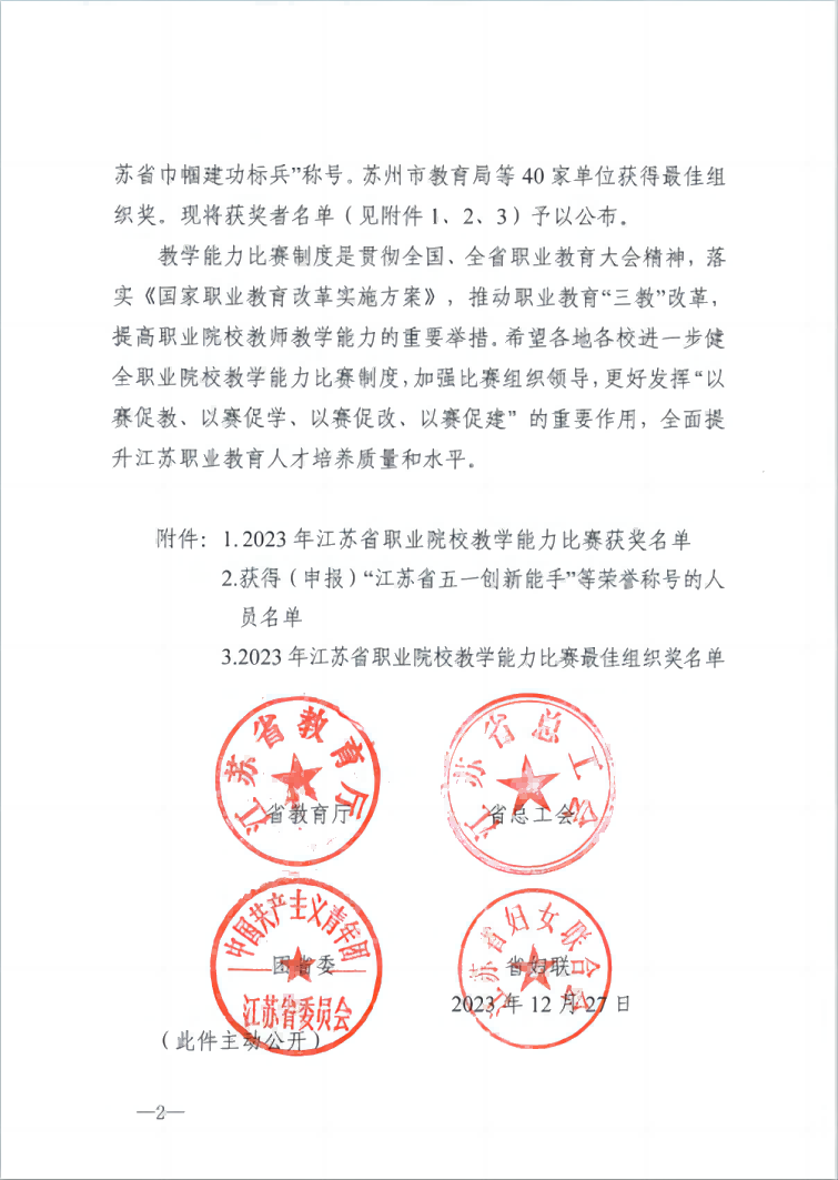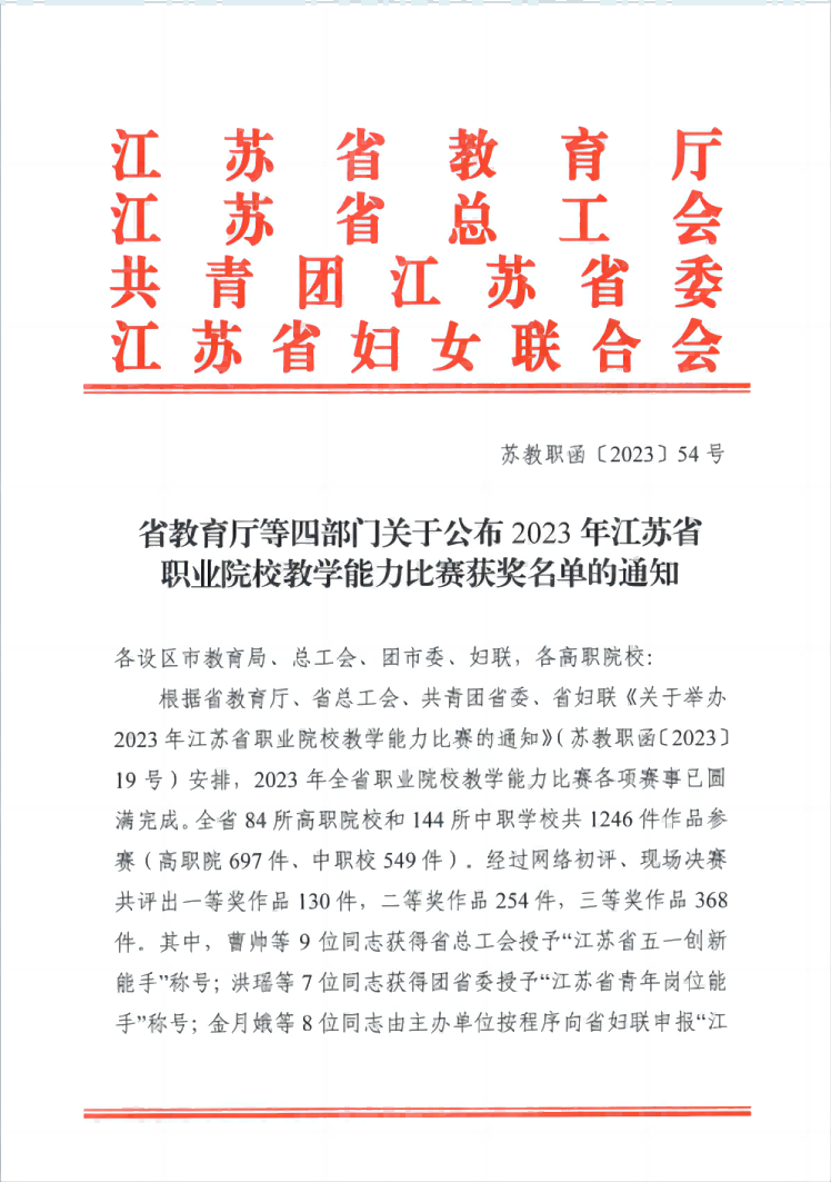 近日,根據《省教(jiāo)育廳等(děng)四部門關於公布2023年江(jiāng)蘇省職業院校教學能力比(bǐ)賽獲獎名單的通知》文件,常州工業職業技術學院榮獲2023年(nián)江蘇省職業院校教學能力比賽最佳組織獎。本次大賽共有228所職(zhí)業院校參加,其中40家單位獲得最佳組織獎。