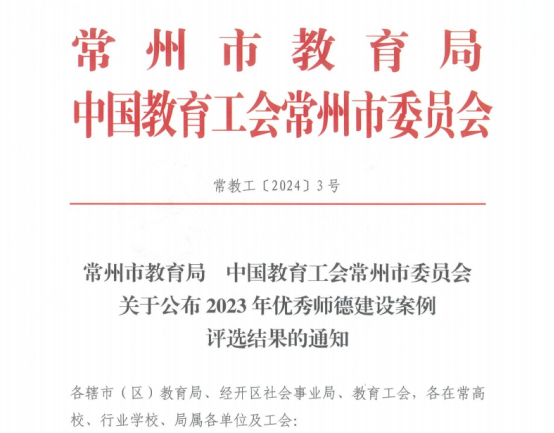 日前,常州市教(jiāo)育局、中(zhōng)國教育工會常州市委(wěi)員會聯合(hé)發(fā)布《關於公布2023年優秀師德建設案例評(píng)選結果的通知》,常州信(xìn)息職業技術學院工會報送(sòng)的(de)《鑄魂育人(rén) 以共(gòng)同的價值(zhí)追求賦能學校高質量發展》榮獲優秀師德建設案例。