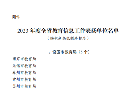 近日,江蘇省(shěng)教育廳發布《2023年(nián)度全省教(jiāo)育信(xìn)息工作情況通報》,對包括5個設區市教育局、22個縣(市、區)教育局、10所本科院校和15所高職(專科)院校進行表揚。常州信息職業技術學(xué)院獲評(píng)“全省教育(yù)信(xìn)息工作表揚單位(wèi)”稱號。