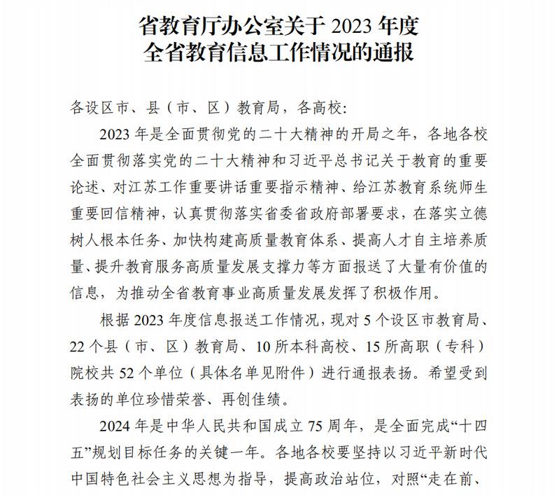 近日,江蘇省教育廳辦公室發布《關於2023年(nián)度全省教育信息工作情況的(de)通報》,常州工業職業技術學院獲評“2023年(nián)度全省教育信息工作表揚單位(wèi)”稱號。這是(shì)學校自2017年起連(lián)續7年獲此殊榮。