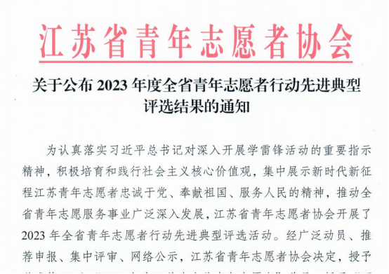 為認真落實習近(jìn)平總書記對深入開展學雷鋒活動的重要指示精神,進一步推進江蘇省青年誌願服務(wù)事業,共青團江蘇(sū)省委、江蘇省誌願者協會啟動了全省青年誌願者行(háng)動評選表彰活動。經過廣泛動(dòng)員、推薦(jiàn)申報、集中評審、網絡公示等環節,常州信息職業技術學院數字經濟學院袁梓皓榮獲“2023年度江蘇省優秀誌願者”稱號(hào);電子(zǐ)工程(chéng)學院“青春(chūn)三原色”誌願服務項目榮獲“2023年度優秀誌願服務項目”;數(shù)字經濟學院青年誌願者協會榮(róng)獲“2023年度(dù)青(qīng)年誌願者行動組織獎”。
