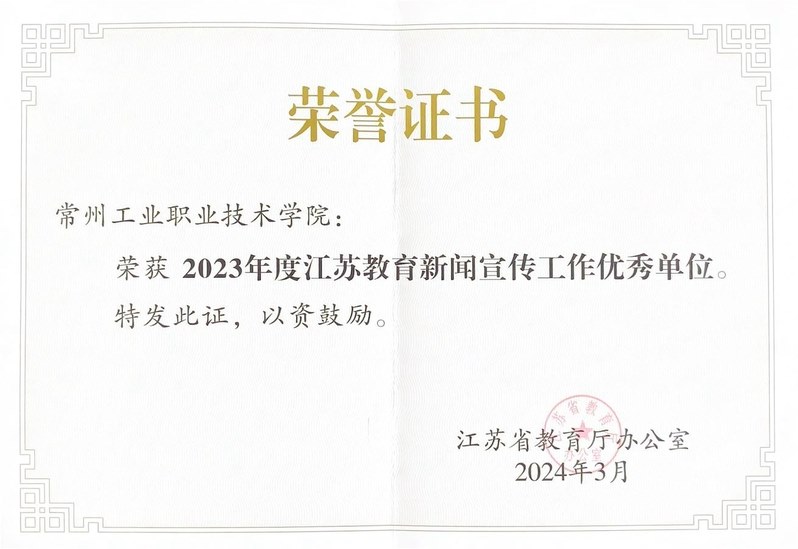 3月21日(rì),江蘇省教育(yù)廳召開2024年全省教育新聞宣傳工作部署推進會。會上公布了2023年度江蘇教育新聞宣傳工作優秀單位名單,常(cháng)州工業職業技術學院在高職院校中排名第5,再次榮獲江蘇教育新聞宣傳工作優秀單位稱號。至此,學校已連(lián)續7年(nián)獲此殊榮。