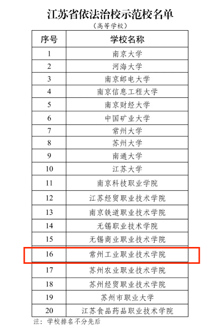 近日,省教育廳(tīng)公布了首批江蘇省依法治(zhì)校示範(fàn)校(xiào)名單,常州工業職(zhí)業技術(shù)學院榮獲江蘇省高等學校依法治校示範校榮譽稱號。