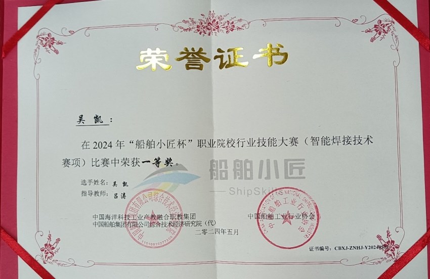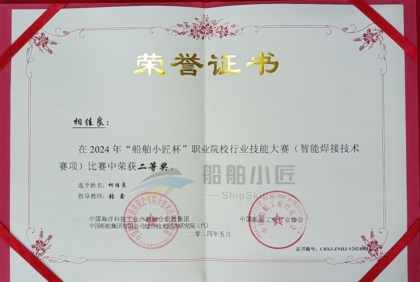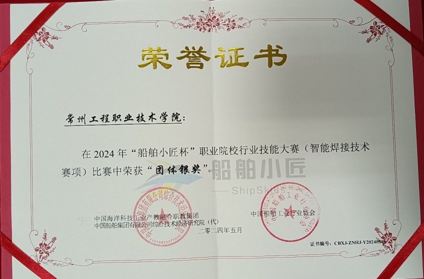 5月26日至29日,2024年全國第三屆“船舶小匠(jiàng)杯”職業院校行業技能大賽“智(zhì)能焊接技術”賽項(xiàng)在威海海洋職業學院成功舉行。本(běn)次大(dà)賽由中國海洋科(kē)技工業產教融合職教集團、中國船舶工業(yè)行業協會主辦(bàn),中國焊接協會支持,中船艦客教育科技(北京)有限公司協辦。比賽吸引了全國(guó)眾(zhòng)多院校精英選手參賽,52支代表隊同場競技,常州工程職業技術學院智造學(xué)院智能焊接技術專業呂濤、張鑫老師指導的學生吳凱、相佳良分(fèn)別榮獲個(gè)人一等獎、二等獎的好成績,學校代表隊榮獲團體銀獎。