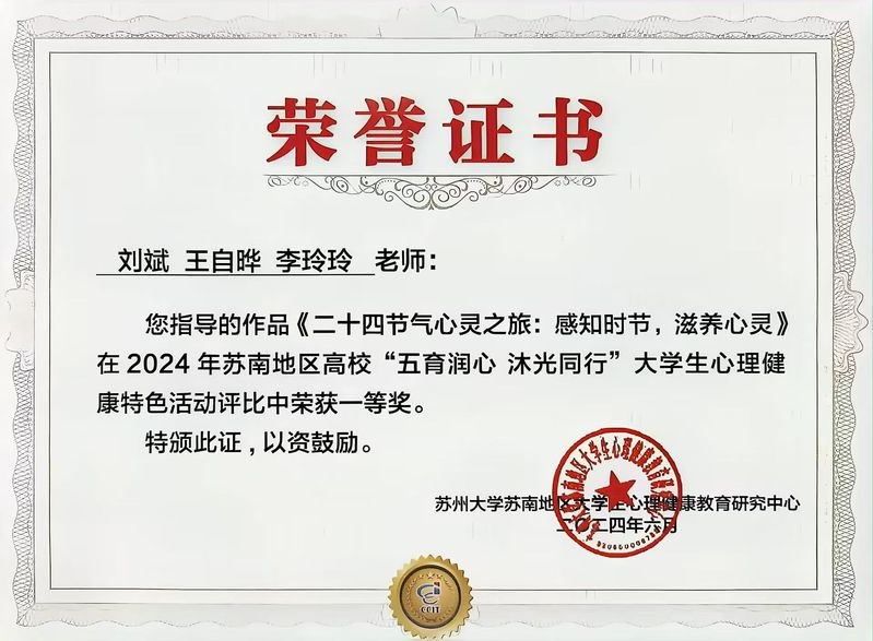 6月13日,蘇南地區高校大學生心理健(jiàn)康教育特色工作(zuò)交流會在常舉辦,來自蘇南地區的27所高校參(cān)加了此次活動(dòng)。常(cháng)州機(jī)電職業技術學院機械工程學(xué)院(yuàn)報送的(de)案例《二十四節氣(qì)心(xīn)靈之旅(lǚ):感恩時節,滋(zī)養心靈》(指導老師:劉斌、王自曄、李玲(líng)玲)獲蘇南地區高校“五育潤心 沐光同行”大學生心理健康特(tè)色活動一(yī)等獎,並受邀進行(háng)大會交(jiāo)流。
