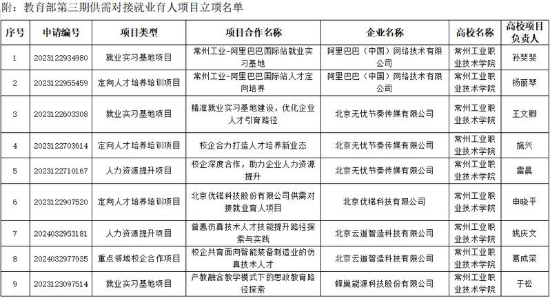 6月(yuè)21日(rì),從產學研合作處傳來喜訊,在近日教育部發布的第三期供需對(duì)接就業育人項目立項名單中,常州工業職業技術學院18項就業育人項目獲批立項,其中重點領(lǐng)域校企合作項(xiàng)目1項,定向人才(cái)培養培訓項(xiàng)目5項,就(jiù)業實習基地項目7項,人力(lì)資源提升項(xiàng)目5項。