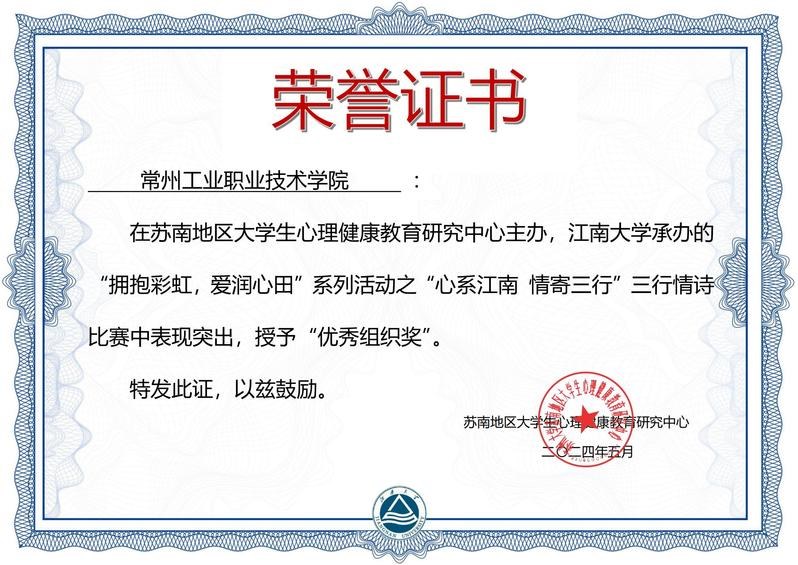 在“心係江南 情寄(jì)三(sān)行”三行情詩比賽中,學校藝術創意學院、材料工程學(xué)院、智能控製學院、旅遊與康養學院、數字商務學院的6個作品入選優秀作品,學校獲“優秀組織獎”。