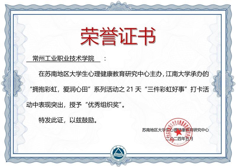 在“擁(yōng)抱(bào)彩虹,愛(ài)潤心田”蘇南地區高校大學(xué)生21天“三件彩虹好事”打卡活動中,學校共有591名學生順利完(wán)成打卡任務,學校獲(huò)“優秀組織獎”。信息工程學院張潔雯和數字商務學院的莫錦華兩位學生獲“優秀聯(lián)絡員”稱號。