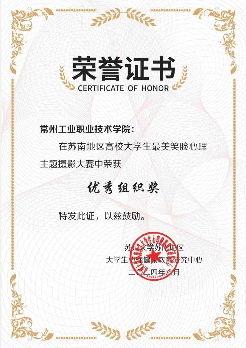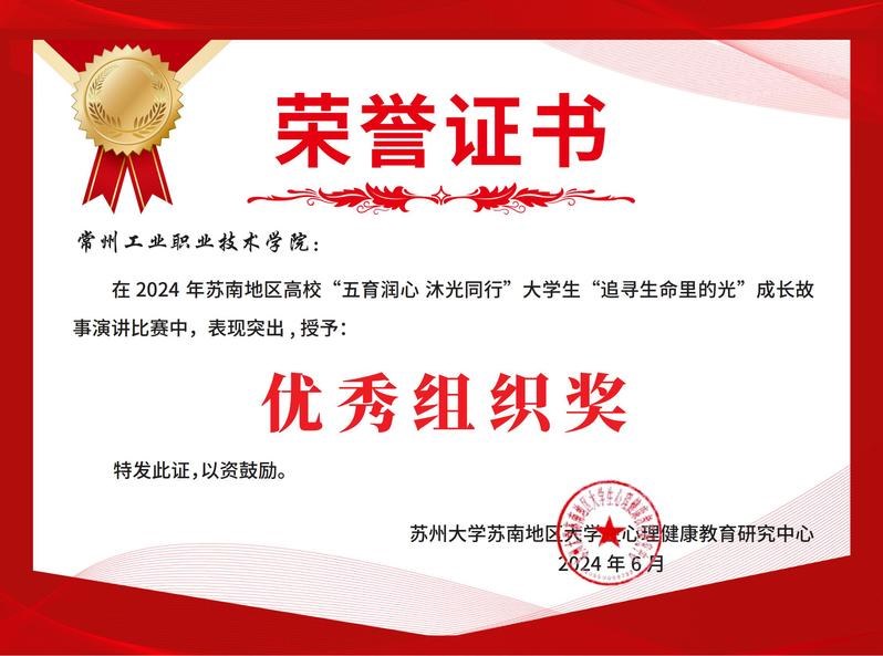 6月24日,從常州工業職業技術學院學工(gōng)處傳(chuán)來喜訊,在近日由蘇南地區大學生心(xīn)理健康教育研(yán)究中心主(zhǔ)辦的大學生心理健康教育活動(dòng)中,我校學生作品獲特等獎2個、一等獎1個、二(èr)等獎1個(gè)、三等獎3個,優秀作品獎6個,13名教師獲評“優秀指導教師”,4個項目獲“優秀組織獎”。