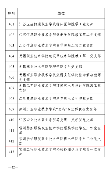 近日,江蘇省委(wěi)教育(yù)工委(wěi)發文公布第二(èr)批全省建黨工作(zuò)示(shì)範高校、標杆院係、樣板支部(bù)培育建設單位名單,常州(zhōu)紡織服裝職業技術學(xué)院服裝與時尚設計學院學生工作(zuò)黨支部、智能製造學院學生工作黨支部獲批“第二批全省黨建工作樣板支部”培育建設單位。