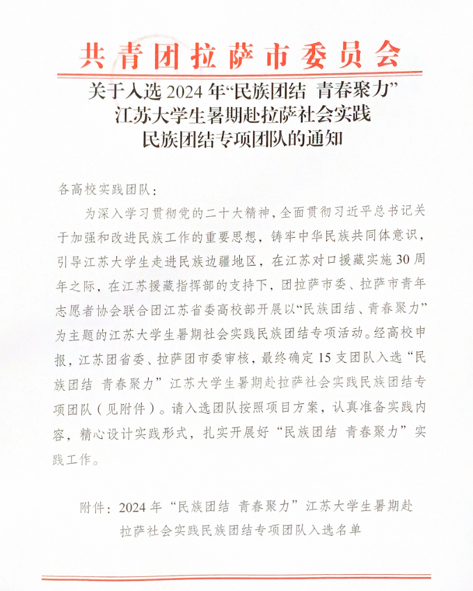 本次評選活動旨在動員江蘇(sū)省大學生走(zǒu)進民族邊疆地(dì)區,開展以民族團結(jié)、衛(wèi)國戍(shù)邊、關愛(ài)青少年等為主題的(de)暑期社會實踐活動,親身體驗在黨的治藏方略下西藏日新月異的發展變化,深入理解(jiě)黨中央實施對口支(zhī)援西(xī)藏的重大意義,不(bú)斷加深對民族團結的理解認(rèn)同,持續鞏固(gù)民族團(tuán)結進步成果(guǒ),服務拉薩高質量發展。經過申(shēn)報、評選、立項等程序,活動主辦部門(mén)遴選出15支(zhī)江蘇高校(xiào)重點實踐團隊,其中高職院校僅入(rù)選3支團隊。