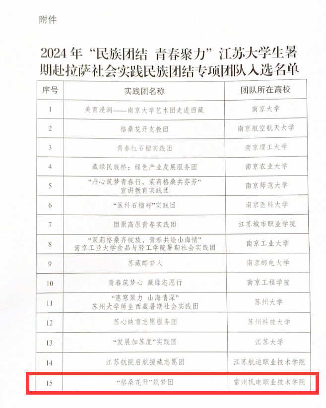 7月12日,由共青團江蘇省(shěng)委高校部(bù)和共青團拉薩市委、拉薩市青年(nián)誌願者協會聯合舉辦的“民族(zú)團結、青春聚力(lì)”江蘇大學生暑期社會實踐民族團結專項活動評選結果揭曉,常州機電職業技術(shù)學院機械工程(chéng)學院“格(gé)桑花開”築(zhù)夢團成功入選省級(jí)重(chóng)點團隊。