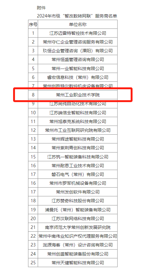 7月21日,從產學研合作處傳來喜訊,在近日常州市工信局公布(bù)的(de)2024年市級“智改數轉網(wǎng)聯”服務商名單中,常(cháng)州工(gōng)業職業技(jì)術學院榜上有名,是25家服務商中(zhōng)唯一高校。此次入選不僅標誌著學校在推動智能化改造(zào)、數(shù)字化轉型及(jí)網絡互聯(lián)等方麵邁(mài)出了堅實的一步,也為學校繼續深化教育數字化發展指明了新的方向。
