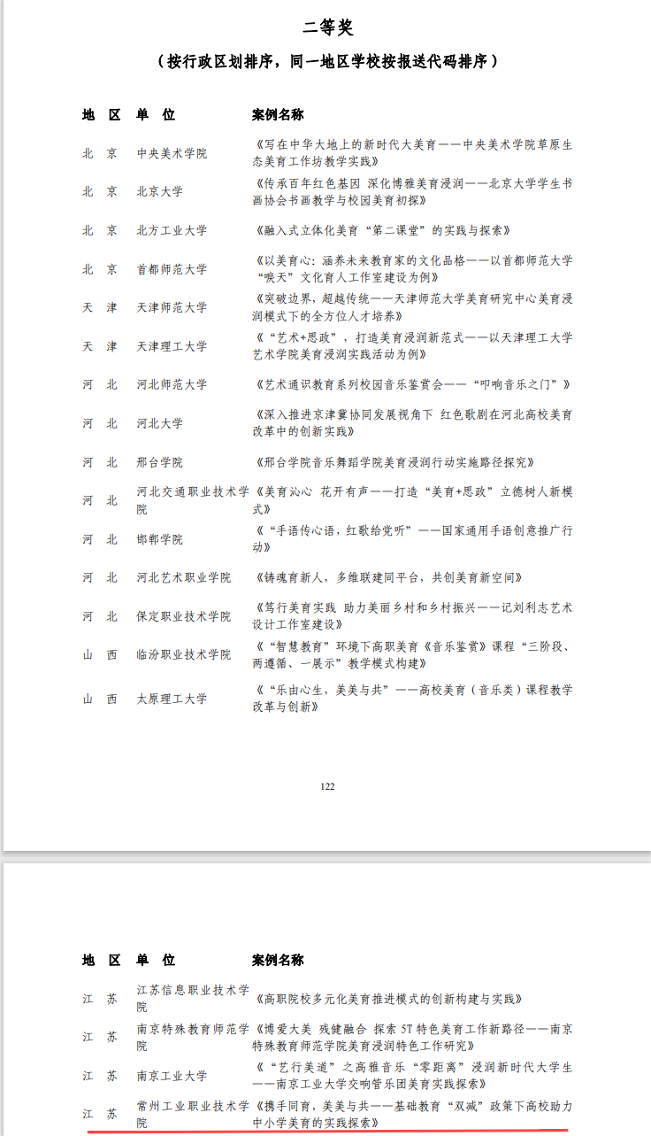 美育改革創新案例《攜手同育,美美與共——基礎教育“雙減”政策(cè)下高校助力中小學(xué)美育的實踐探索》展示了學校通過(guò)與常州市(shì)11所中小(xiǎo)學合作共建“課後服務課程示範基地”,在“吾有優學”彩虹橋APP公益平台上線(xiàn)19門美育課程,開發(fā)“美育+思(sī)政”“美育+勞育”“美育+工匠文化”等(děng)菜單(dān)式美育課程,助力(lì)基礎教(jiāo)育學校長(zhǎng)效化開展美育(yù)實踐活動,探索推進大中小學美育(yù)一體化建設(shè)。案例不僅僅是學術研究的(de)成果,更是實際應(yīng)用中的成功經(jīng)驗。